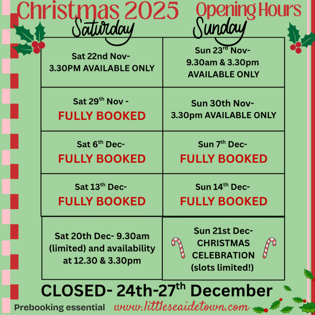 Little Seaside Town offers 3 play sessions per day- 9.30am-11.30am, 12.30-2.30pm and 3.30pm-5.30pm. OPENING TIMES ARE SUBJECT TO CHANGE- WE ARE A PREBOOK VENUE- WALK-INS NOT ALWAYS POSSIBLE DURING BUSY PERIODS AND EARLY CLOSURES. Ticket holders have priority.